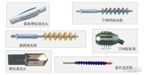 工作原理:YT-1800A型凝汽器清洗機的清洗工具,是直接裝在軟軸頂端,機器將水送進軟軸封套直達清洗工具。清洗刷,是尼龍和豬棕兩種材料制作。刷子的直徑大一被清洗管道2mm為宜,刷子的頂端可安裝硬垢清洗頭,用來疏通已堵的管子,疏通效果好,不會劃傷管壁。